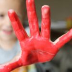 - Start with the handprint: help your child paint their left hand red (they will love this part. You can talk about how the paint feels on their hand. This is a good sensory learning experience):