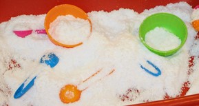The process of making the snow offers your child sensory learning by using their senses to feel the texture.  Sensory learning is especially important for writing. While you play with your child, use vocabulary to describe how it feels.