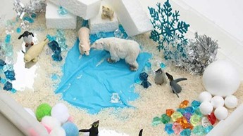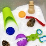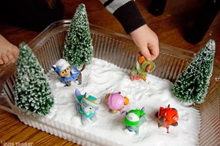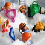 They can also imagine and recreate a construction site, a winter world with wildlife, and so many other things. Encourage them to look around the room and see what they can play with in their fresh new snow!