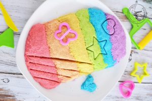 Kinetic sand is used for children with special needs, as it develops their sensory awareness, and has a calming effect. It is wonderful for babies for the same reason – it is ideal for sensory play as well as fine motor skills, which are both critical for writing. As its name implies, thanks to the addition of a polymer, regular play sand develops properties of motion (becoming kinetic). Your child will experience, through playing with kinetic sand, how force affects motion (engineering). Making the sand is excellent for math (measuring, quantities, mass) and science (by seeing how the different ingredients interact with each-other). Kinetic sand is a wonderful S.T.E.M. activity!