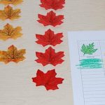 - Go on a walk outside and take the time to play with leaves before you collect them (optional). During play, ask your child about the way the leaves feel on their hands, or how they sound when they walk over them. Chat about the scents of fall, the colours they see, the shapes of the leaves, the size of the trees and of the leaves, the different sorts of leaves and trees they find, etc. Don’t “quiz” your child, just talk about these things as if you were chatting to a friend about it. These types of conversations are the ideal way for your child to increase their vocabulary as well as they math language and math knowledge. Your child will also learn about nature, about why the leaves fall, about the trees and how many years it takes for them to be as tall as they are (if you are not sure, google is your friend here). Explore, explore, explore. Enjoy nature with your child and they will develop a lifelong love for the outdoors, and respect for the natural world. Don’t rush this part of the activity – fully immerse yourself in it!