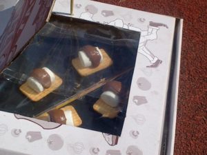 - Now you can try your solar oven. Prepare your s’mores and put them inside your new solar oven (this may take 1 hour so get your timers ready for you children to measure time. Also add a thermometer inside the oven so they can see the temperature rise and measure that too – all great for math skills). Leave the aluminium-covered lid propped up (use the stick for this) so it works by reflecting the solar energy into your oven (see pictures below):