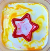 - touch the tip of the cotton swab to the centre of the milk that is inside the cookie cutter (the one with the green colour) and leave it for 10 to 15 seconds without stirring it. You will be amazed at the beautiful reaction of the colour in the milk! A picture does not do it justice, please try it